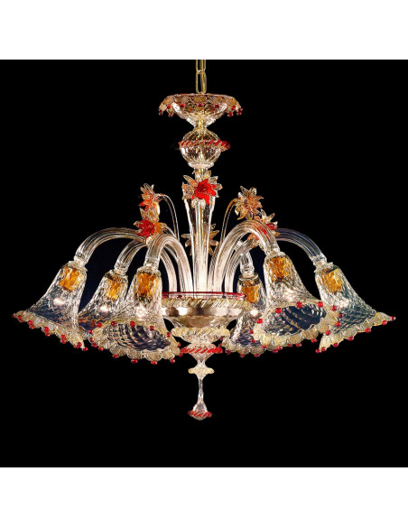 Their long stem rises from the cup in the center of the chandelier, with its golden border embellishing it even more, despite its already naturally regal, austere and important appearance. Each element of the chandelier, from the lamp holder to the support bases, from the cups to the charms inserted in the curvatures of the arms, is finely finished with delicate golden brushstrokes that, combined with the crystal, transform the chandelier into a true work of art. Two variants can be made: crystal / gold and crystal / gold / ruby. Both unique in their kind, they are elegant and refined, designed to give character and identity to every type of environment.