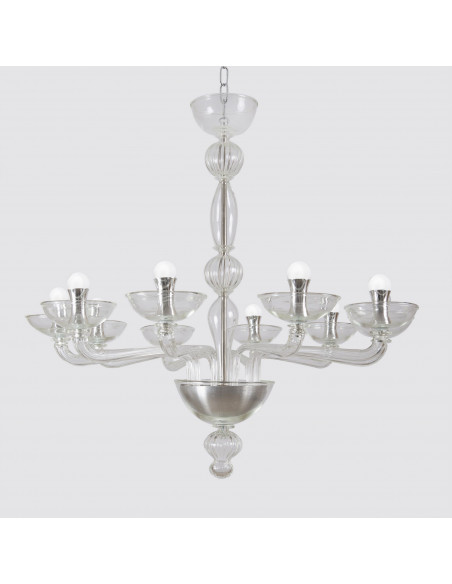 The simple but luxurious and elegant lines make this Murano glass chandelier very versatile, allowing it to be inserted both in classic environments (giving a touch of modernity) and in modern environments (bringing the charm of the classic).