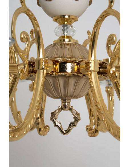 Classically elegant chandelier featuring a French gold brass frame, a central Capodimonte ceramic element, and glass crystal accents. Handcrafted product with certificate.