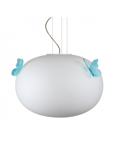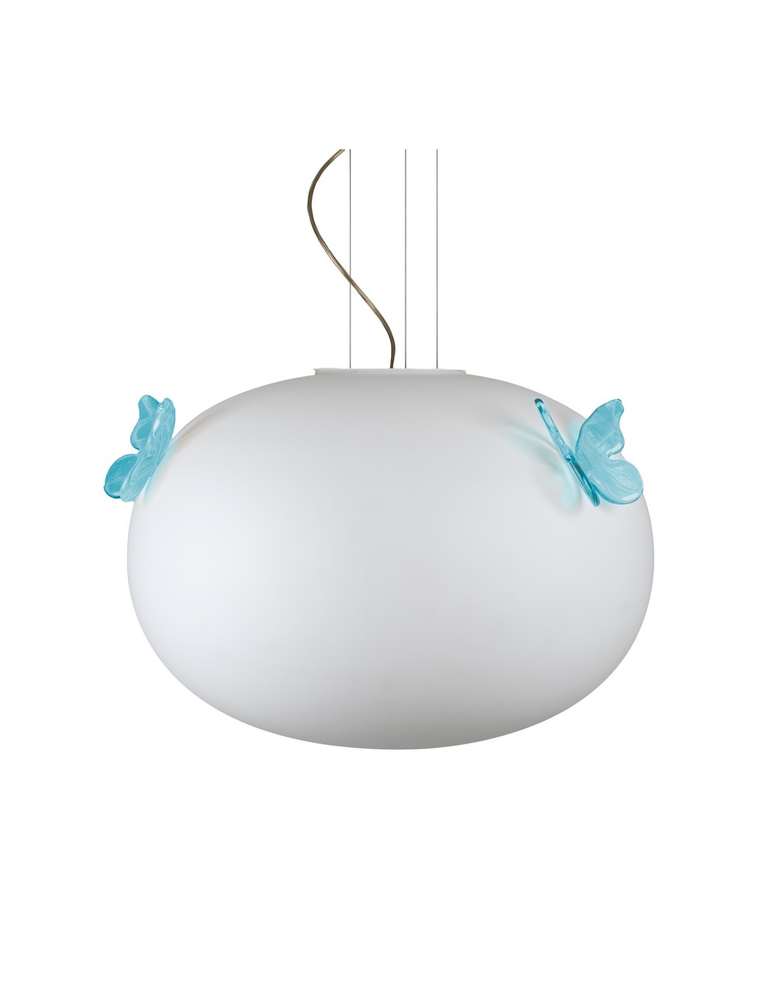 Elegant and refined suspension lamp with a flattened sphere in white satin crystal and three Murano glass butterflies, available in different colors.