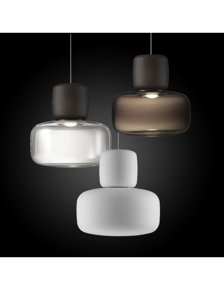 Lorsqu'il est allumé, le verre blanc diffuse la lumière de manière homogène et agréable, tandis que la couleur fumée crée une atmosphère intime et hospitalière. Le cristal vous permet de jouer avec différentes ampoules avec différentes températures de couleur.