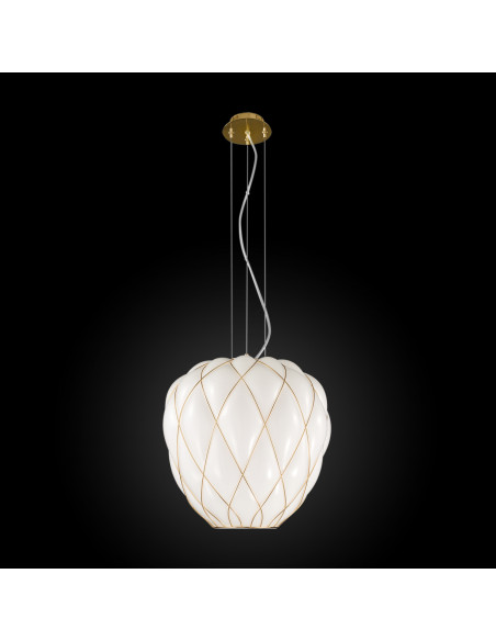 La suspension Cavea attire avec son verre de Murano soufflé à l'intérieur d'une cage dorée.