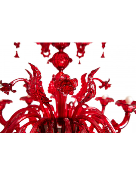 De multiples procédés caractérisent ce lustre, les feuilles et les fleurs riches en détails sont finement travaillées par nos maîtres verriers de Murano.
