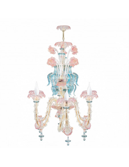 De beaux contrastes en bleu, rose et or se trouvent dans tous les détails de ce magnifique lustre.