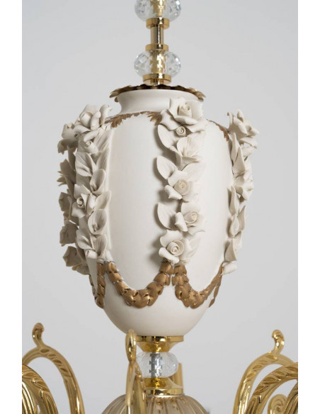 Un chandelier au style classique, doté d’un corps central en porcelaine de Capodimonte finement décorée et d’une structure en laiton finition or français.Produit artisanal certifié.