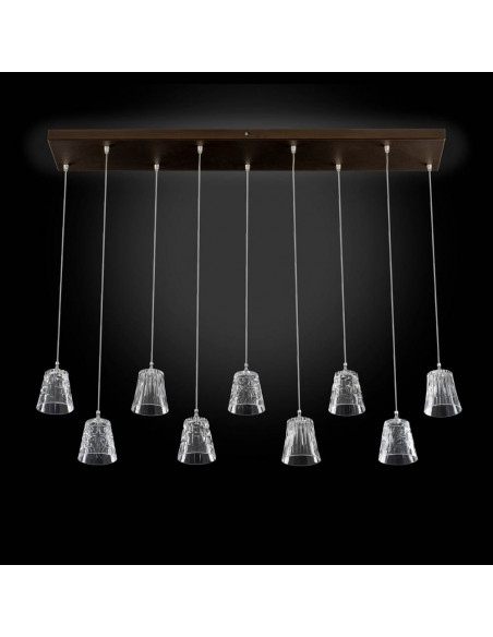 La struttura rettangolare, disponibile in metallo brunito o avorio, si fissa a soffitto e ospita nove vetri artistici, ciascuno diverso per forma e decoro. Ogni vetro è sospeso tramite un cavo trasparente regolabile in altezza, permettendo di creare configurazioni personalizzate e dinamiche.