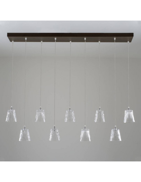 Lampada moderna da soffitto con nove vetri sospesi, ideali per tavoli e isole cucina.