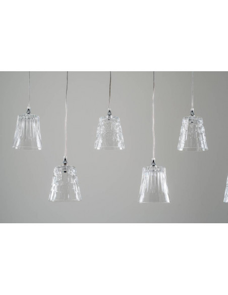 Ogni elemento in vetro è dotato di una propria sorgente luminosa con attacco G9, offrendo un’illuminazione puntuale e suggestiva.
